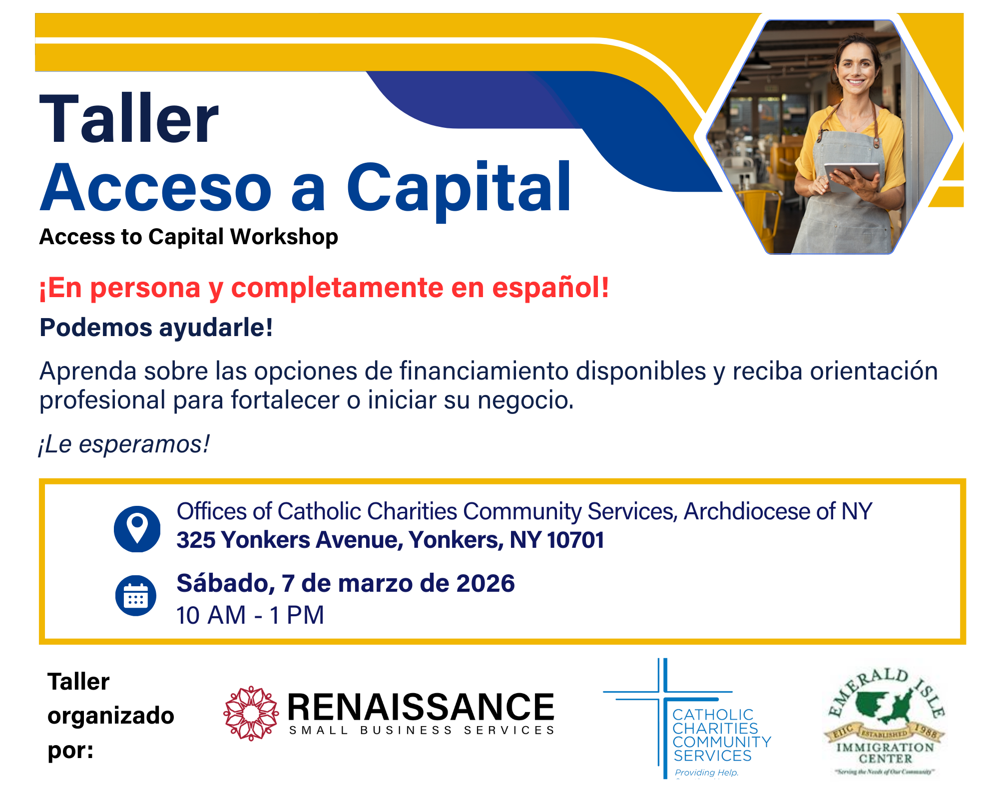 Podemos ayudarle! Aprenda sobre las opciones de financiamiento disponibles y reciba orientación profesional para fortalecer o iniciar su negocio. Offices of Catholic Charities Community Services, Archdiocese of NY 325 Yonkers Avenue, Yonkers, NY 10701