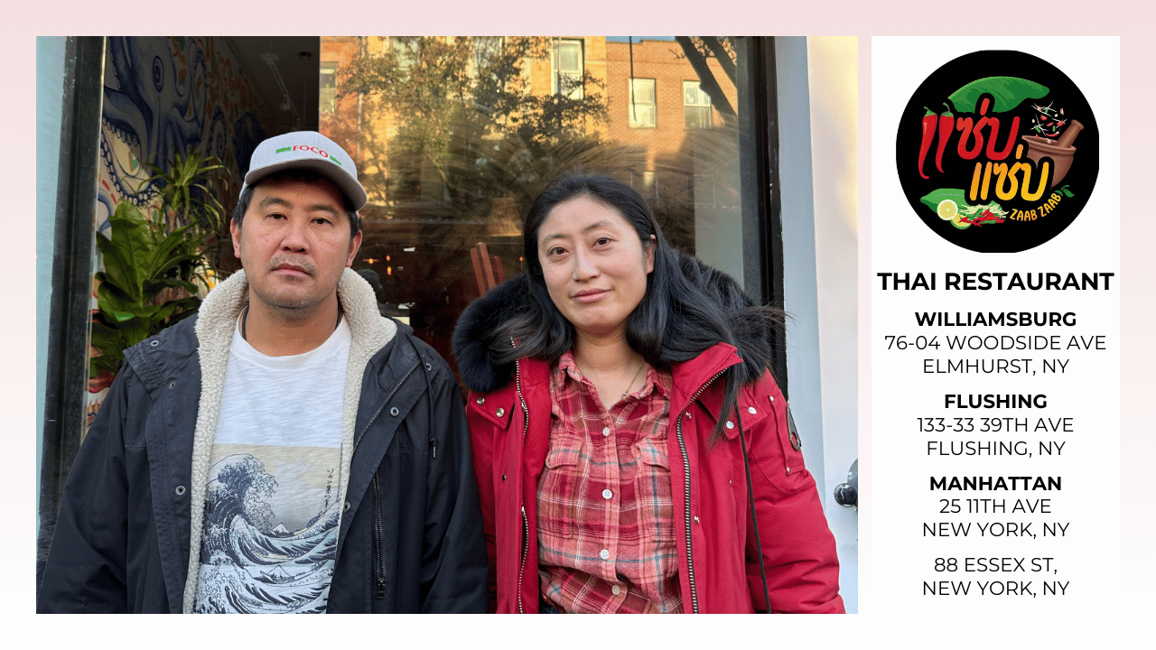 Eat Gai Inc. and #1 Pho Inc. (both DBA Zaab Zaab) comprise two restaurants located in Elmhurst, Queens, and Williamsburg, Brooklyn, respectively, specializing in cuisine originating from the Isan region of northeast Thailand. Established in 2018, the business has two co-owners, each owning a 50% share: Ms. Pei Shan Wei and Mr. Chaitawat (Bryan) Chunton. Mr. Chunton partnered with Ms. Wei on this venture after a fire burned down his previous restaurant.