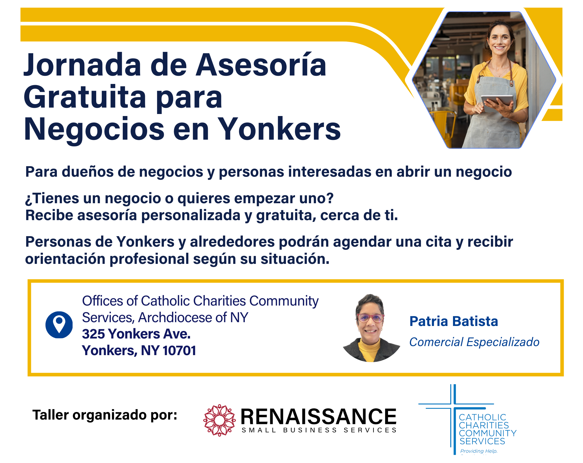 ¿Tienes un negocio o quieres empezar uno? Recibe asesoría personalizada y gratuita, cerca de ti. Personas de Yonkers y alrededores podrán agendar una cita y recibir orientación profesional según su situación. Offices of Catholic Charities Community Services, Archdiocese of NY - 325 Yonkers Ave. Yonkers, NY 10701